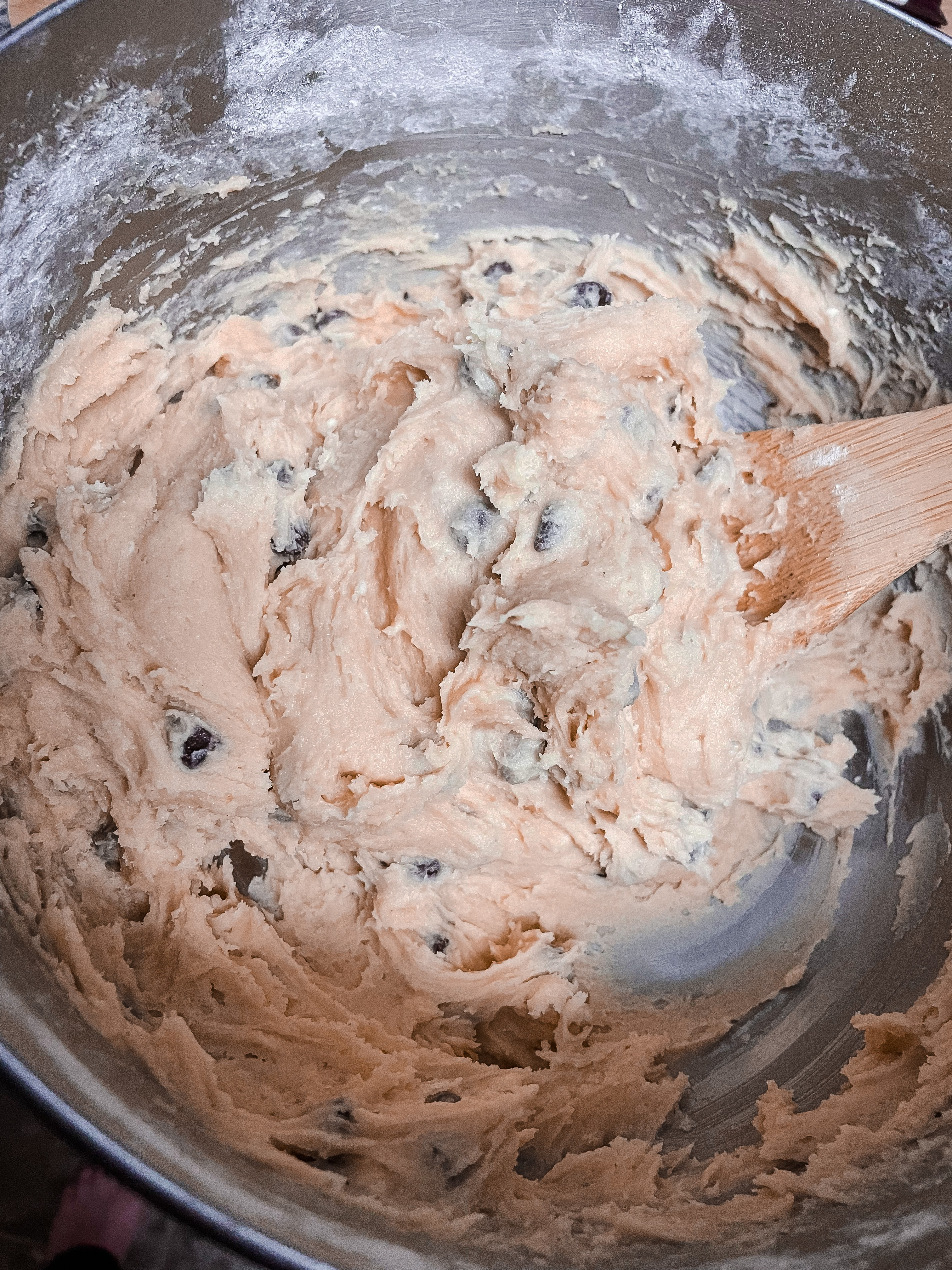 Beat the butter + sugar + brown sugar + vanilla in a large bowl until it’s creamy. Add in the eggs one at a time and beat well.