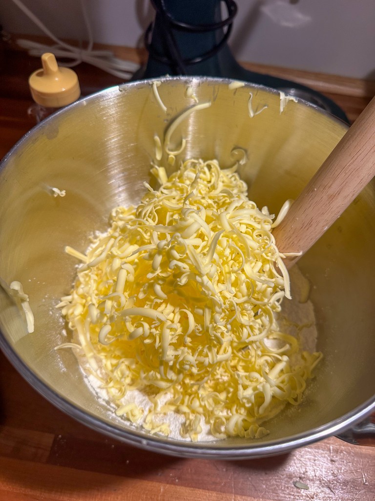 Grate the 113g of cold butter into a large mixing bowl. Add the 300g of flour to the butter. Using a fork mix the flour and butter until they begin to form pea-sized crumbs.