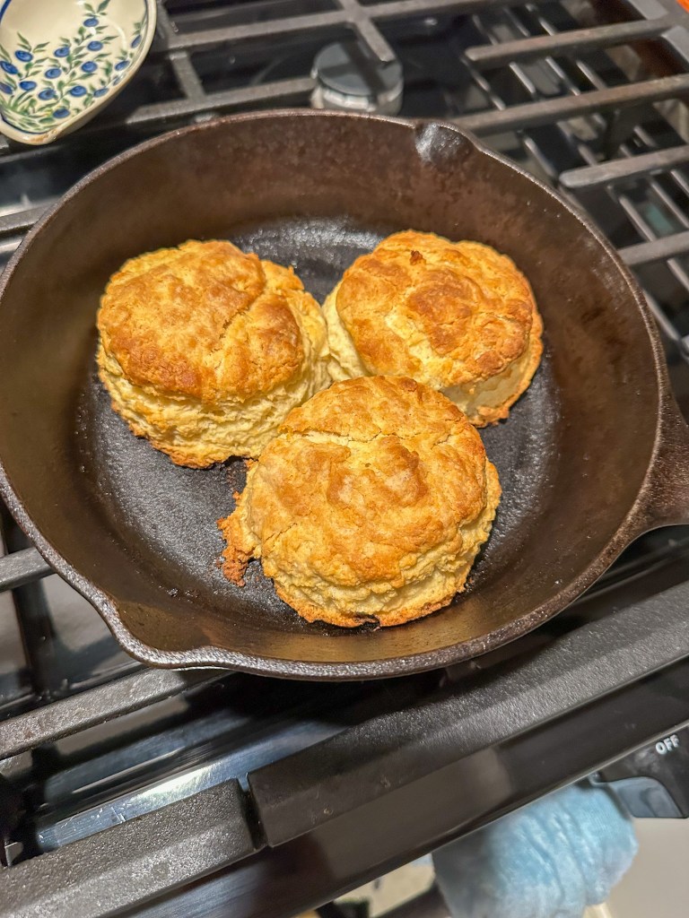 Flour your counter and turn the dough out onto it. Flour the dough and press it into a 1inch rectangle shape. Cut out the biscuits and arrange in the skillet.