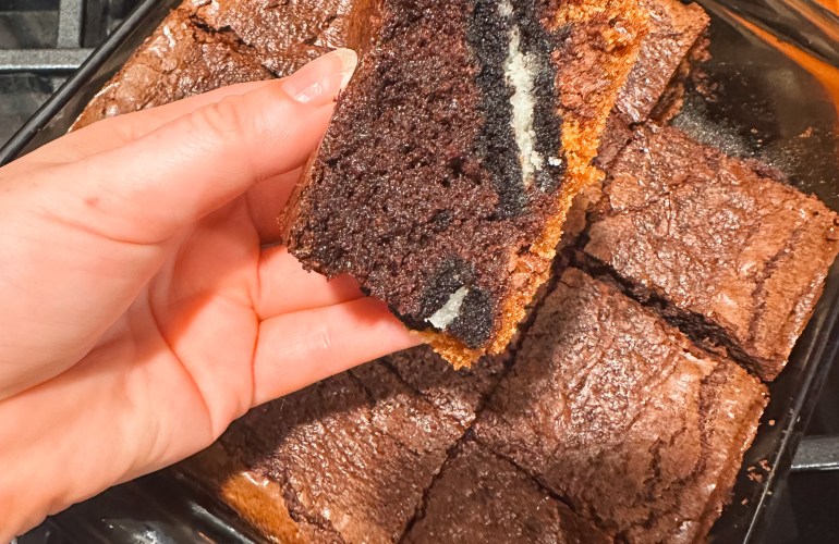 In a separate bowl, whisk together flour + baking soda + kosher salt, then add it to the bowl of wet ingredients. Mix in the dry ingredients until almost completely mixed in.