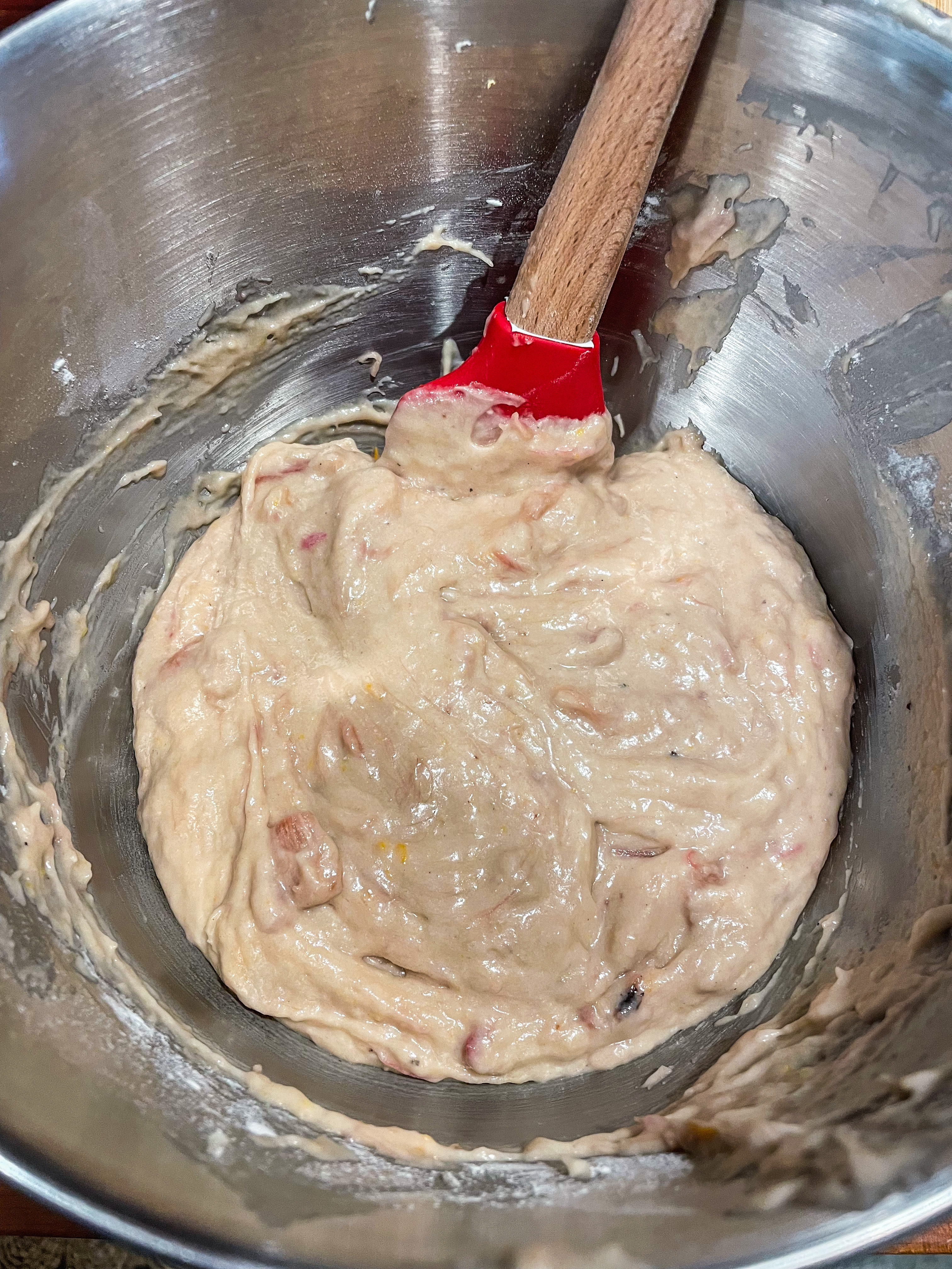 Fold in ¾ of the amount of the apple-cinnamon mixture into the batter, then pour it into the prepared loaf pan.