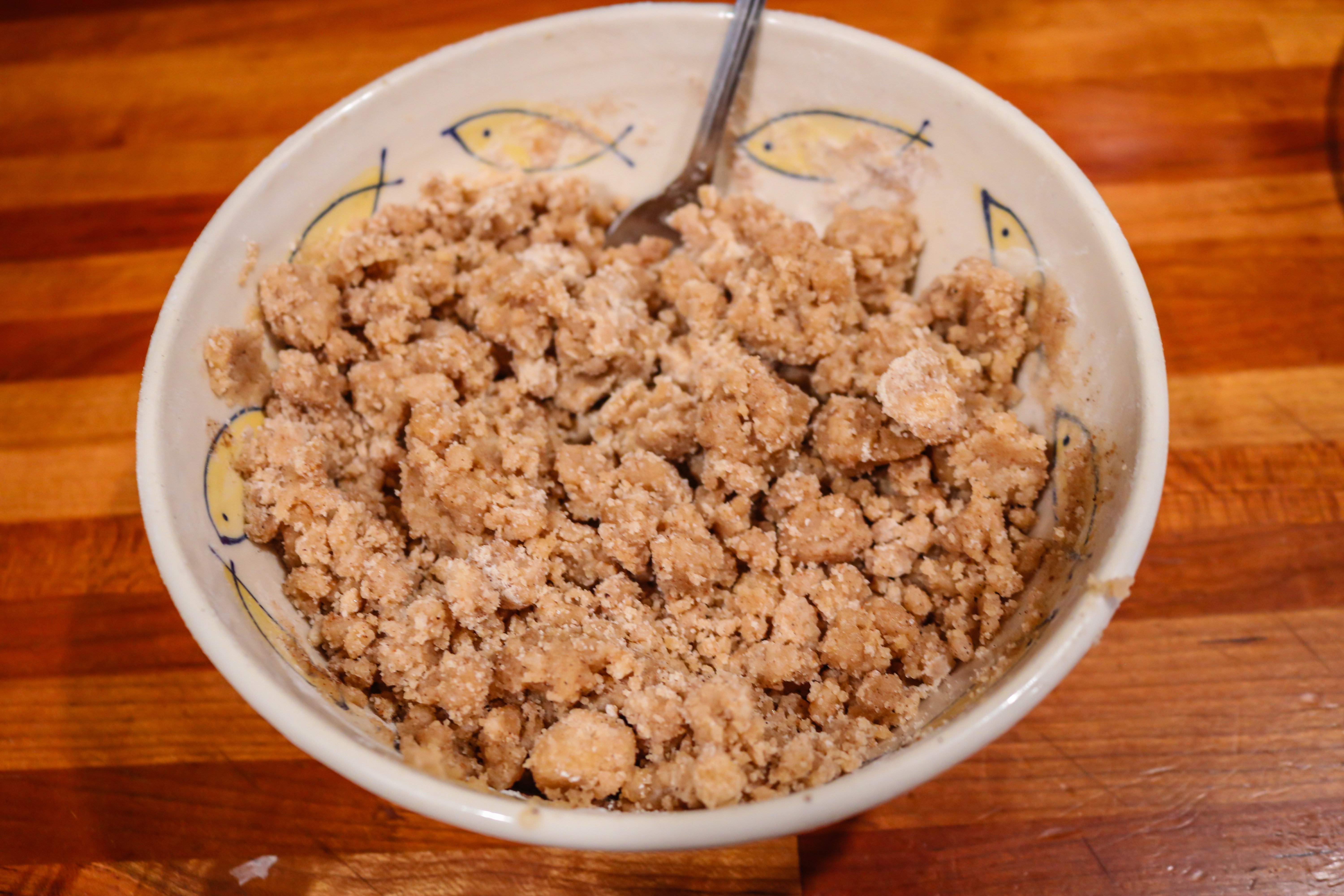 In a medium mixing bowl, mix the chopped apples + brown sugar+ cinnamon + ginger together and set aside.