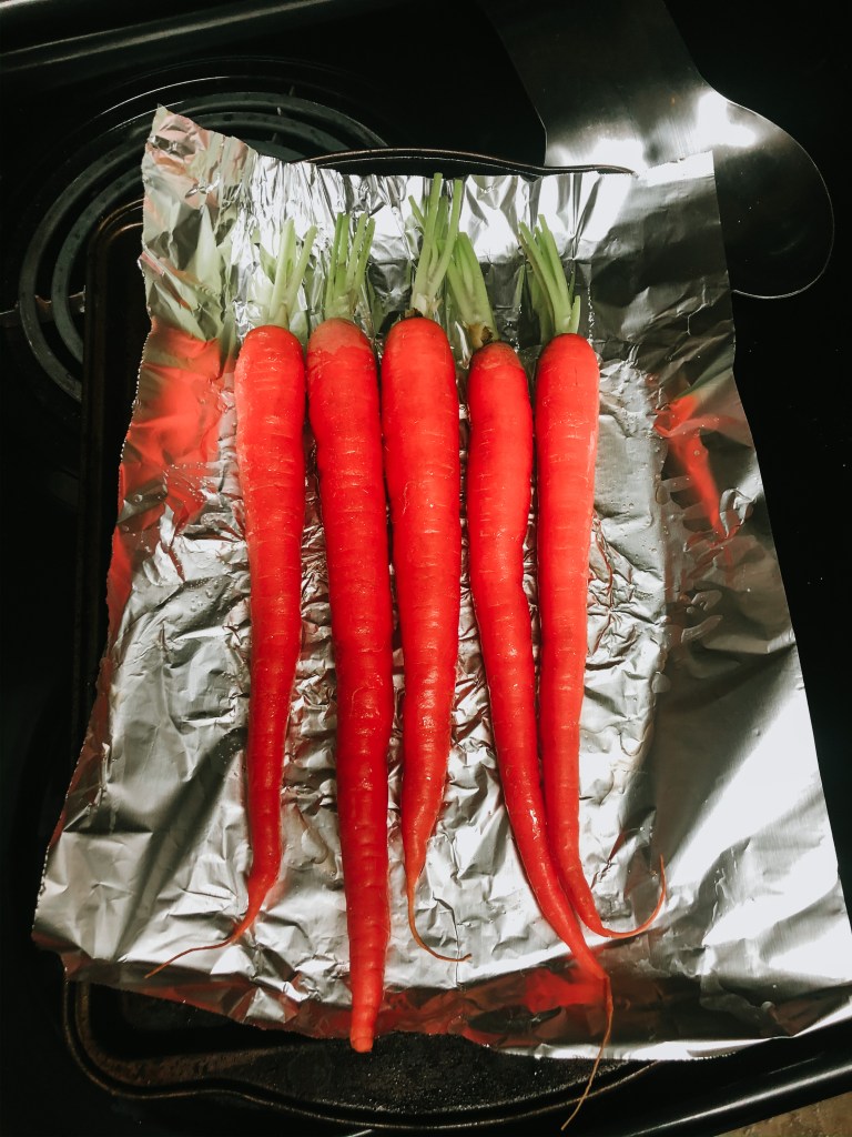 Cut off the green tops of the carrots leaving about and inch of the stem. SAVE THE CARROT GREENS! Rinse off the carrots and place them on a baking sheet. Though not recommended I always line my baking pans with aluminum foil for easy clean up.