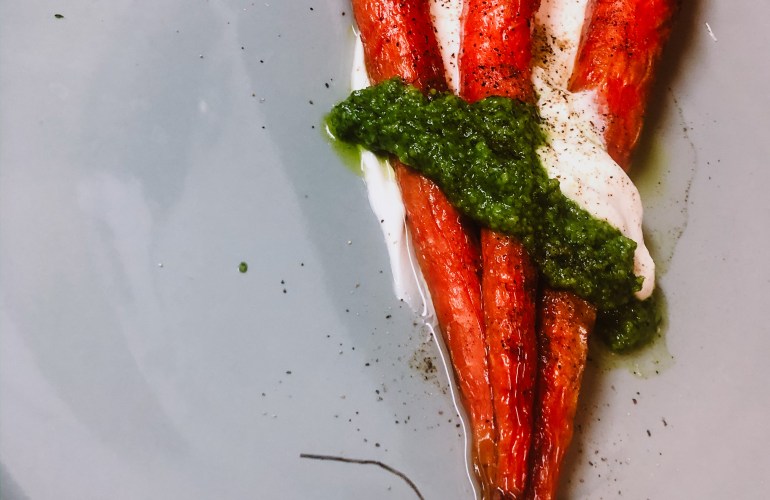 I have been dying for Antoni’s cookbook, Antoni in the Kitchen, since it came out, dropping hints to family and friends as the holiday’s approached. Thankfully my mother listened and gifted me with a signed copy of the book. I was thrilled, sharing with my family that I was going to Julie and Julia my way through this cookbook. Now that the new year is upon us a goal of mine has been to dedicate my Sunday’s to a home-cooked meal. For the first Sunday of the year, I started with Antoni’s Roasted carrots with a Carrot Top Pesto. The recipe is as follows from Antoni’s cookbook, which I highly recommend you go out and buy right now!