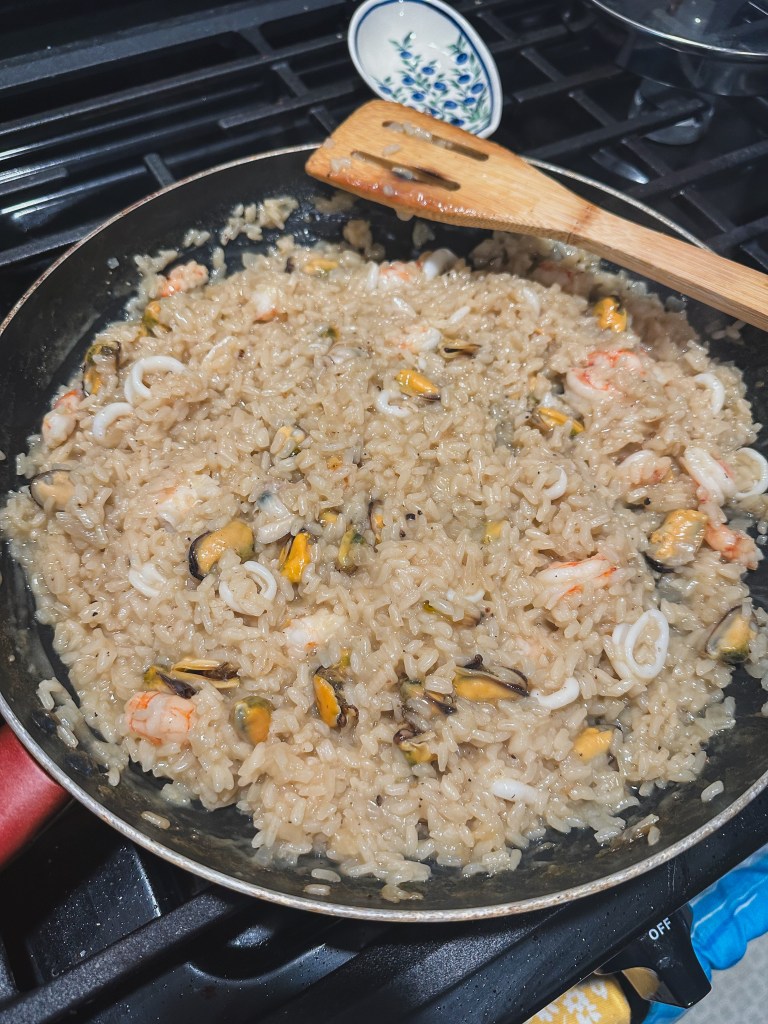 I’m going to make the declaration that risotto is an underrated food. She is so versatile but I don’t feel that she gets the credit that she deserves. I went to a local restaurant and they served a blue cheese risotto and I COULD NOT STOP THINKING ABOUT IT. So rather than trying to recreate it and disappoint myself, I figured I’d go with the next best option, which was seafood risotto. I used the seafood stock that I just made and this frozen Mediterranean mix from Pana Pesca, which was such a freaking lifesaver and so much cheaper! Shout out to NYT Cooking for guidance on this dish. Remember when it comes to risotto, patience is a virtue.