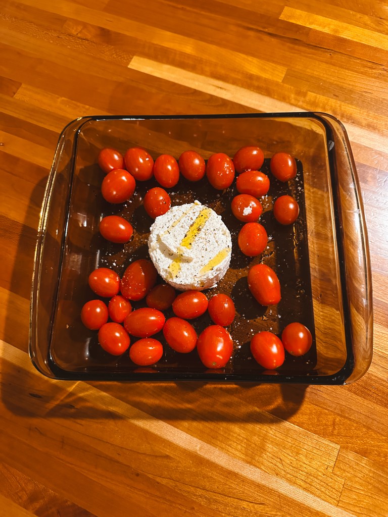 In a separate baking dish, combine cherry tomatoes + borsin cheese + olive oil + salt + pepper.
