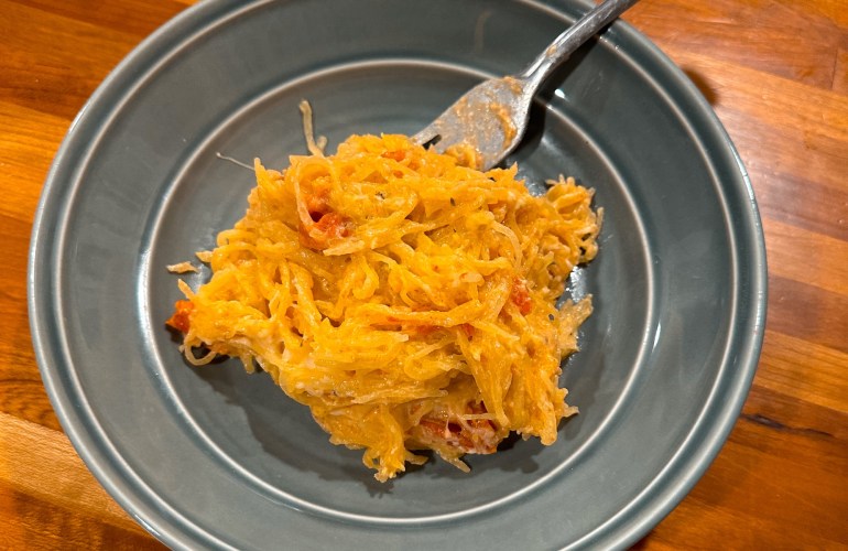 Bake both the squash and tomatoes for about 45 minutes. Remove the squash from the hard outer shell with a fork, making spaghetti-like strands, and place it into the dish with the cheese + tomatoes. Mix until the squash is well coated with the sauce. I like to top it with a little extra parm.