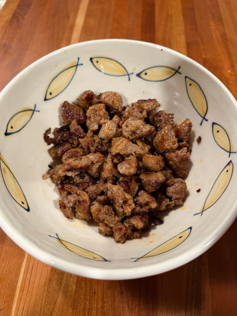 In a large skillet brown your sausage, making sure to break it down into small pieces. Once mostly browned add in the 1 TBSP of sun-dried tomatoes.