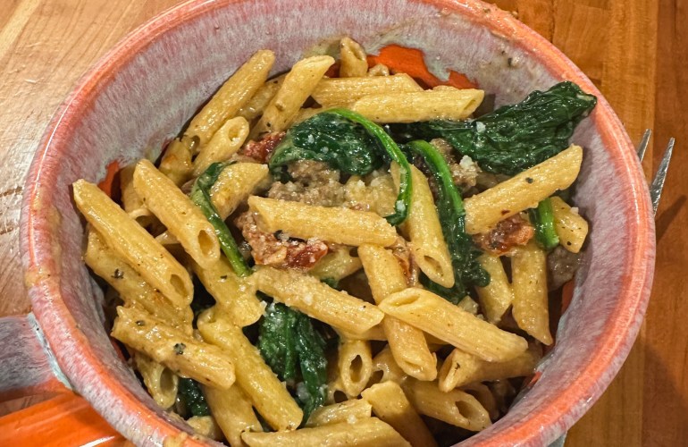 Cracked Pepper Pasta with Spicy Sausage, Spinach, & Sundried Tomatoes