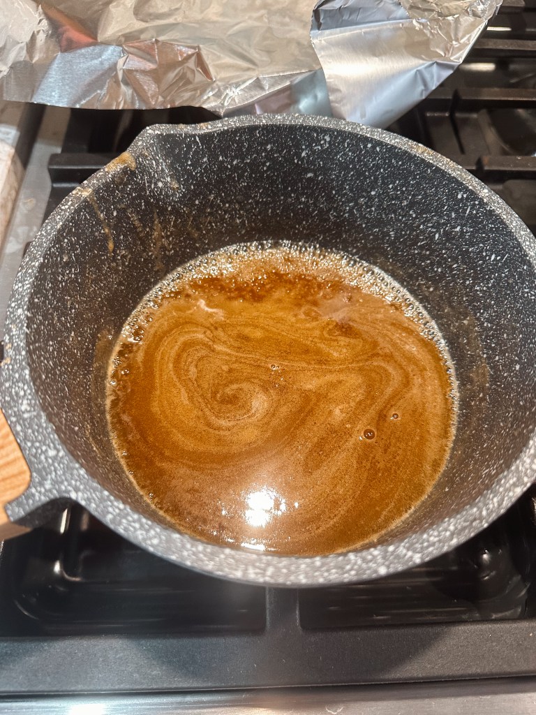 In a small saucepan, melt the remaining 5 TBSP of Butter + 1 Cup Dark Brown Sugar, then whisk in 1/3 Cup Apple Cider + 1/4 Cup Bourbon + Pinch of Salt. Let bubble on the stove top for 1 minute, then remove and drizzle over the sweet potatoes, tossing gently to coat. Roast in the oven, stirring with a wooden spoon every 10 minute for about 40 minutes, until the sweet potoates are tender.