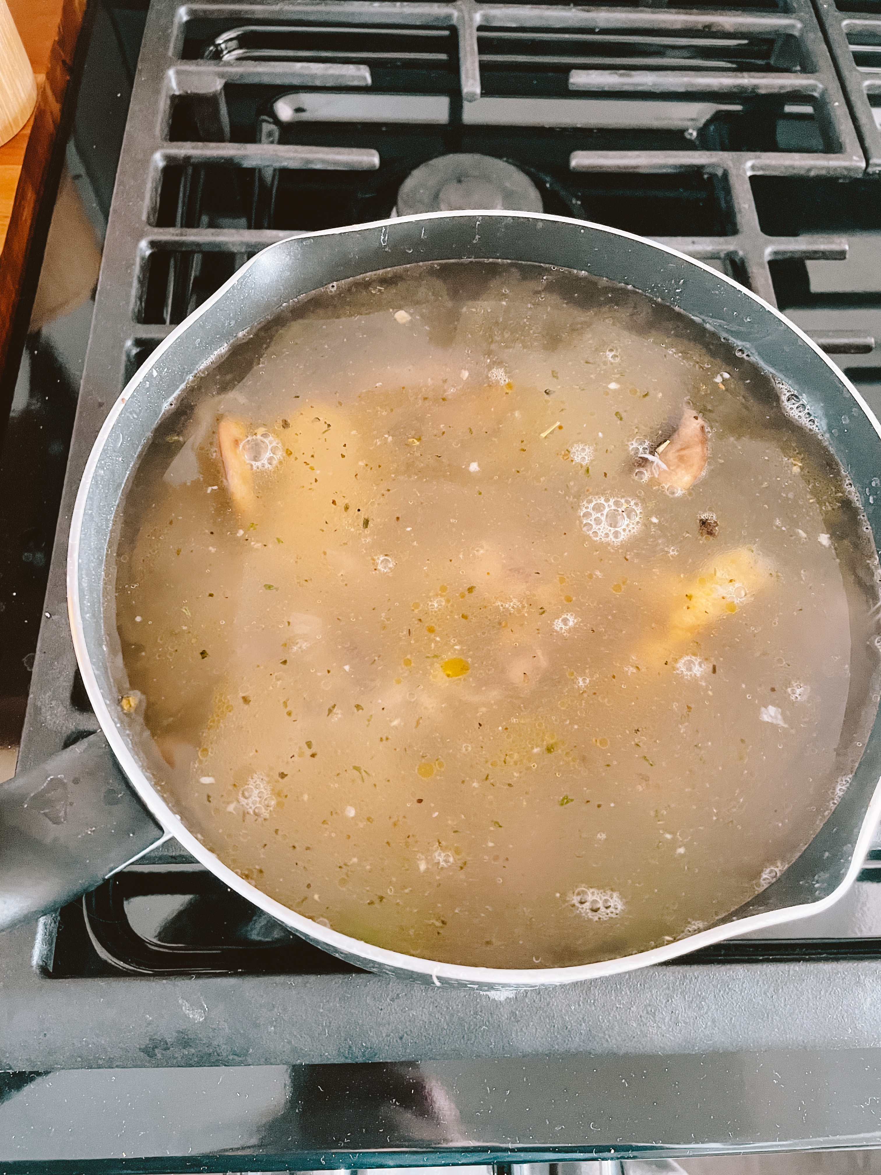 Return lemon to pot & add parmesan rind, broth, and few grinds of pepper; season with salt. Increase heat to high and bring broth to boil. Reduce heat to MED; simmer until reduced slightly and broth smells lemonly, about 15 minutes.