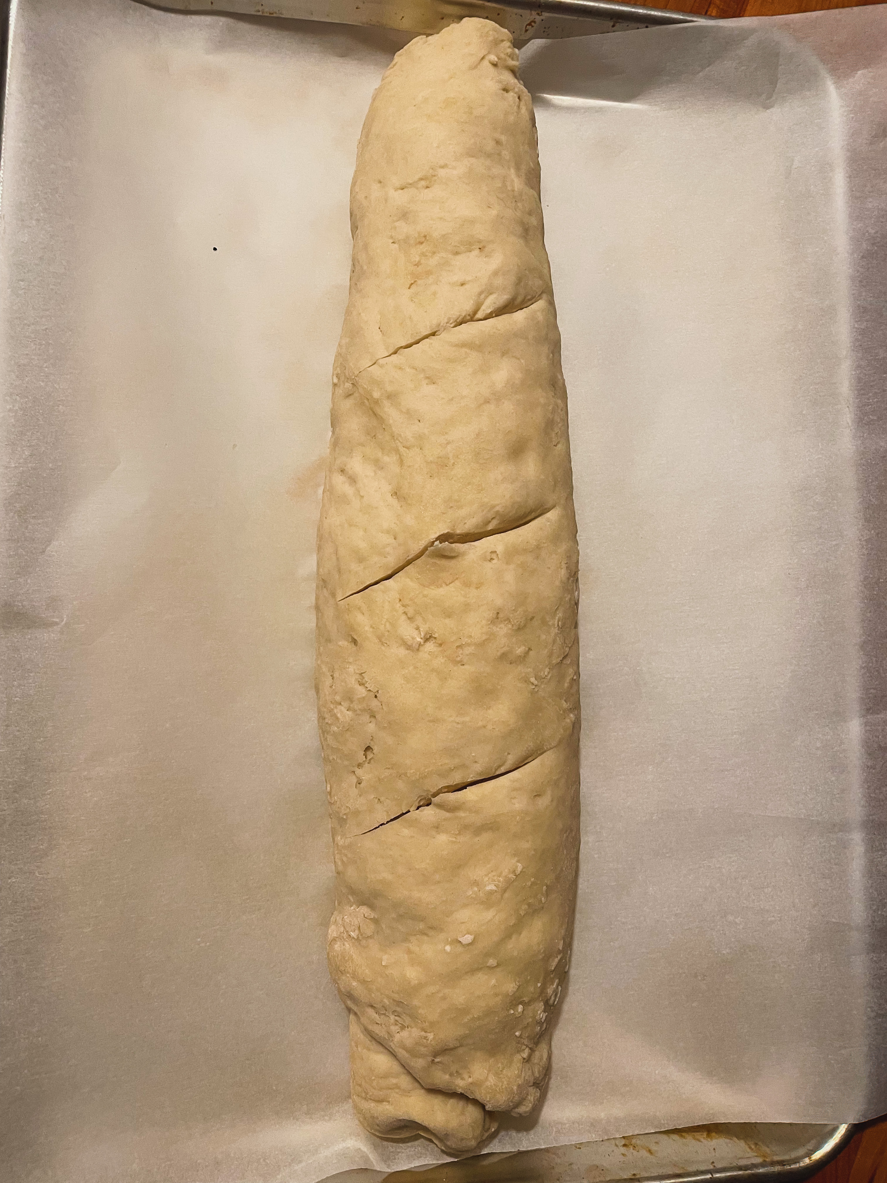 Time to shape! Turn out your dough on a lightly floured surface. Pull out the edges of the dough to create a rectangle. Add in the remaining walnuts + blue cheese. Fold one side halfway into the rectangle and fold the other side over that. Roll the dough away from you, creating a log. Place your hands on the sides of the dough and begin pulling towards yourself to get rid of the seams and create a tighter ball. Prepare a bowl by placing a towel in the bowl and sprinkling flour on the towel. Place the dough ball upside down [or seam side up] into the prepared bowl. Cover with the towel and let it proof for one hour on the counter before moving it into the fridge overnight.