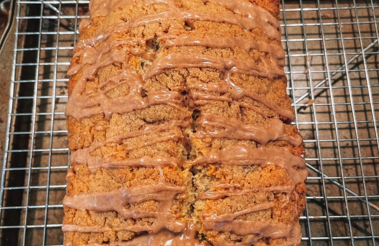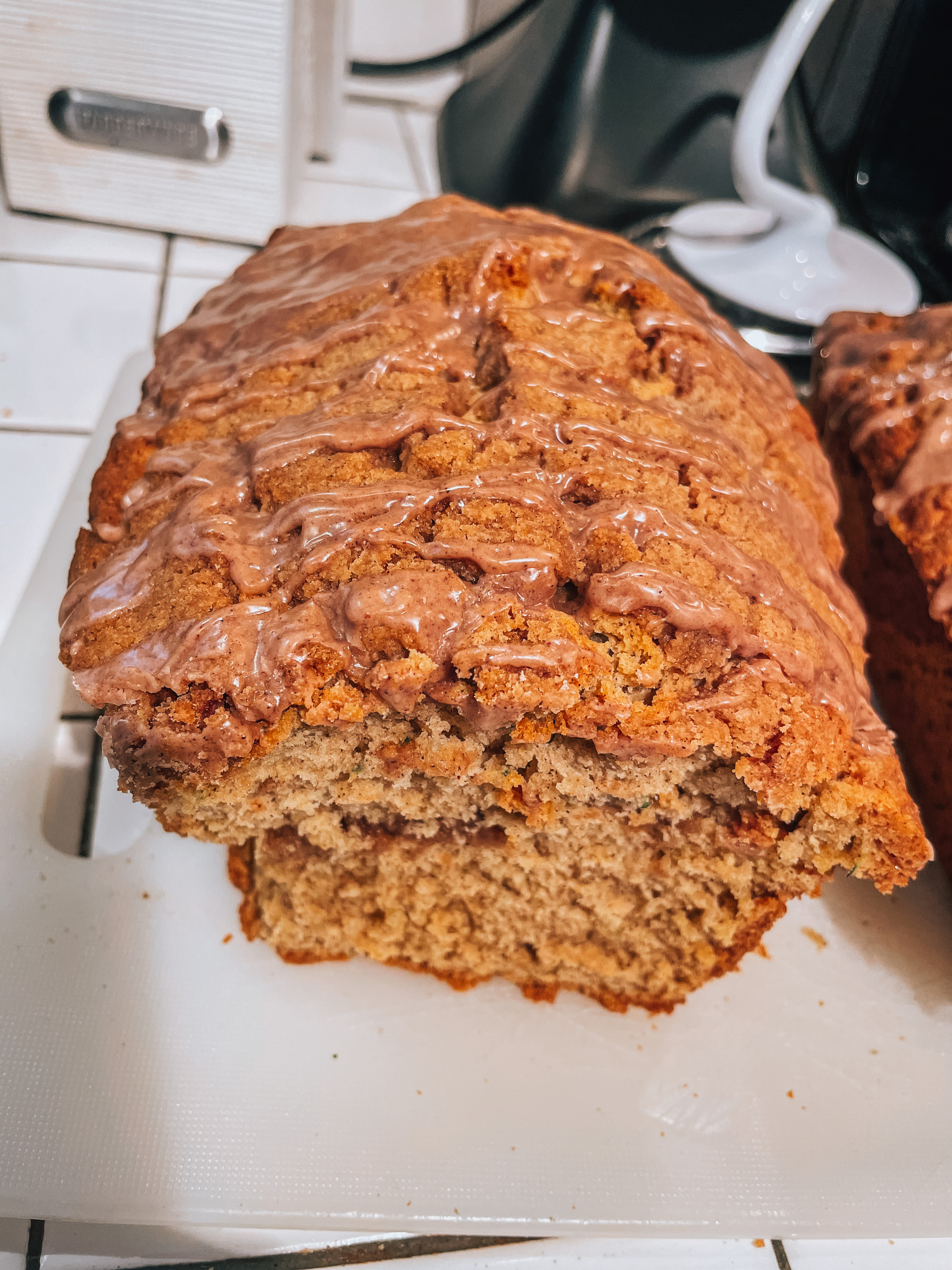 While the bread is cooking, in a small mixing bowl, whisk together the powdered sugar + vanilla extract + milk until it comes to a smooth consistency.