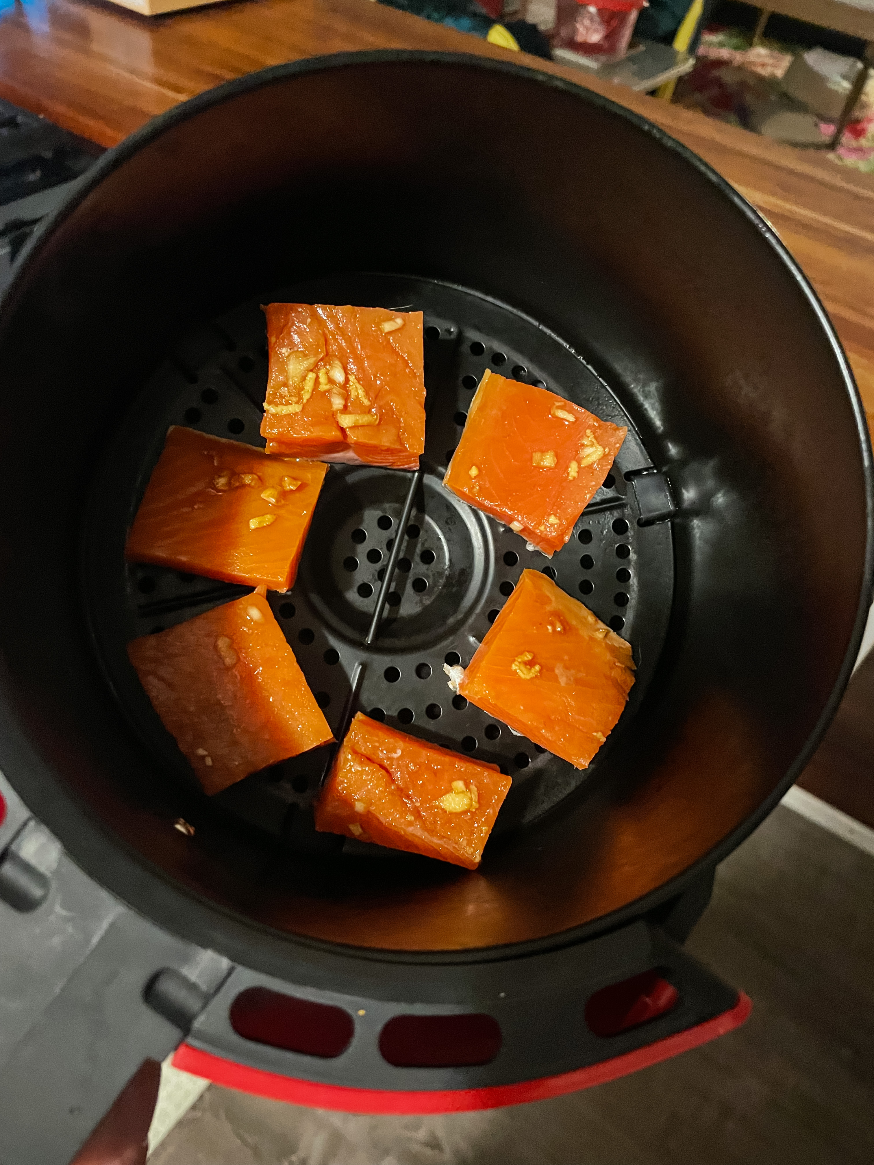 As we can tell from the recipes on this blog I love rice. It is just as universal as a potato; it can be breakfast, lunch, or dinner. Due to being in the interrum before the new year, grocery shopping is really one of the last things I want to do. In my house, I never fail to have rice and some sort of vegetable on hand. That is where these rice bowls really come in handy. Past-Hannah picked up a salmon filet at ALDI [she was thinking ahead] so I decided these spicy salmon airfryer bowls would be the perfect week-night meal. Being that it is only me, it also makes the perfect work-day lunch.