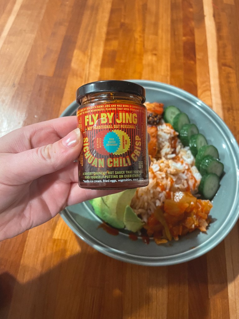 Staring with rice + a little extra soy sauce and sriracha + cucumber + avocado + salmon + kimchi + cream cheese + Sichuan chili crisps [my new obsession, they aren’t wrong when they say you can put it on everything].