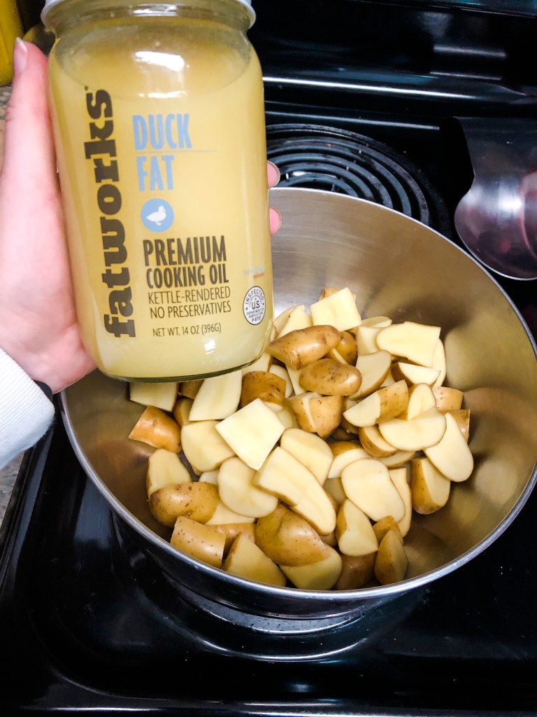 To start the potatoes, cut them and preheat the oven to 425F with the rack in the middle. Place the cut potatoes into a bowl and toss with the duck fat + salt. Place the potatoes on a baking sheet, cut-size down, and leave space in-between to let the potatoes crisp up. Cook for about 25-30 minutes, getting the potatoes nice and brown and crispy.