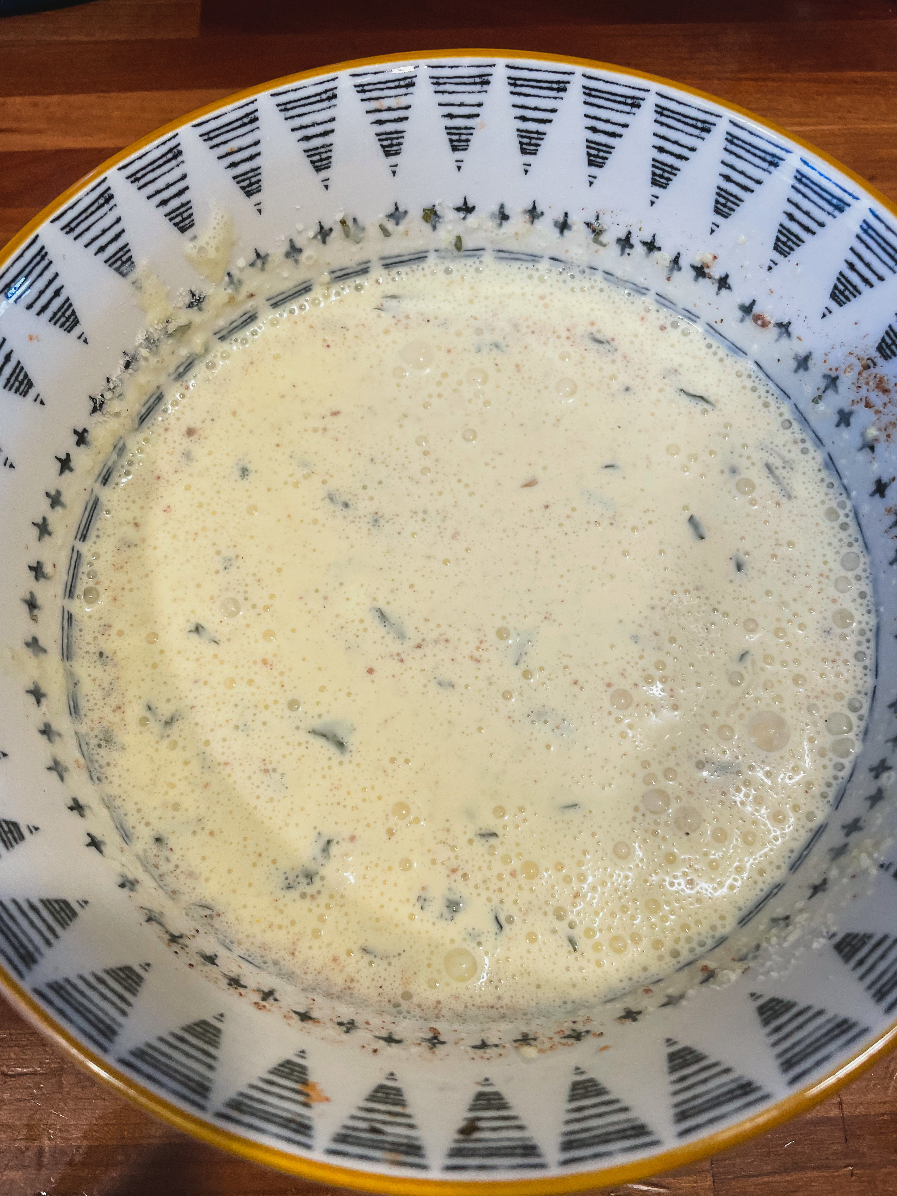 Once your onions are caramelized and a deep brown color, add your garlic + nutmeg + pepper + fresh thyme and sauté for an additional 2 minutes. Deglaze the pan with your white wine + Worcestershire, scrapping all bits from the bottom of the pan. Let simmer for 1-2 minutes, or just until the wine is reduced by half.