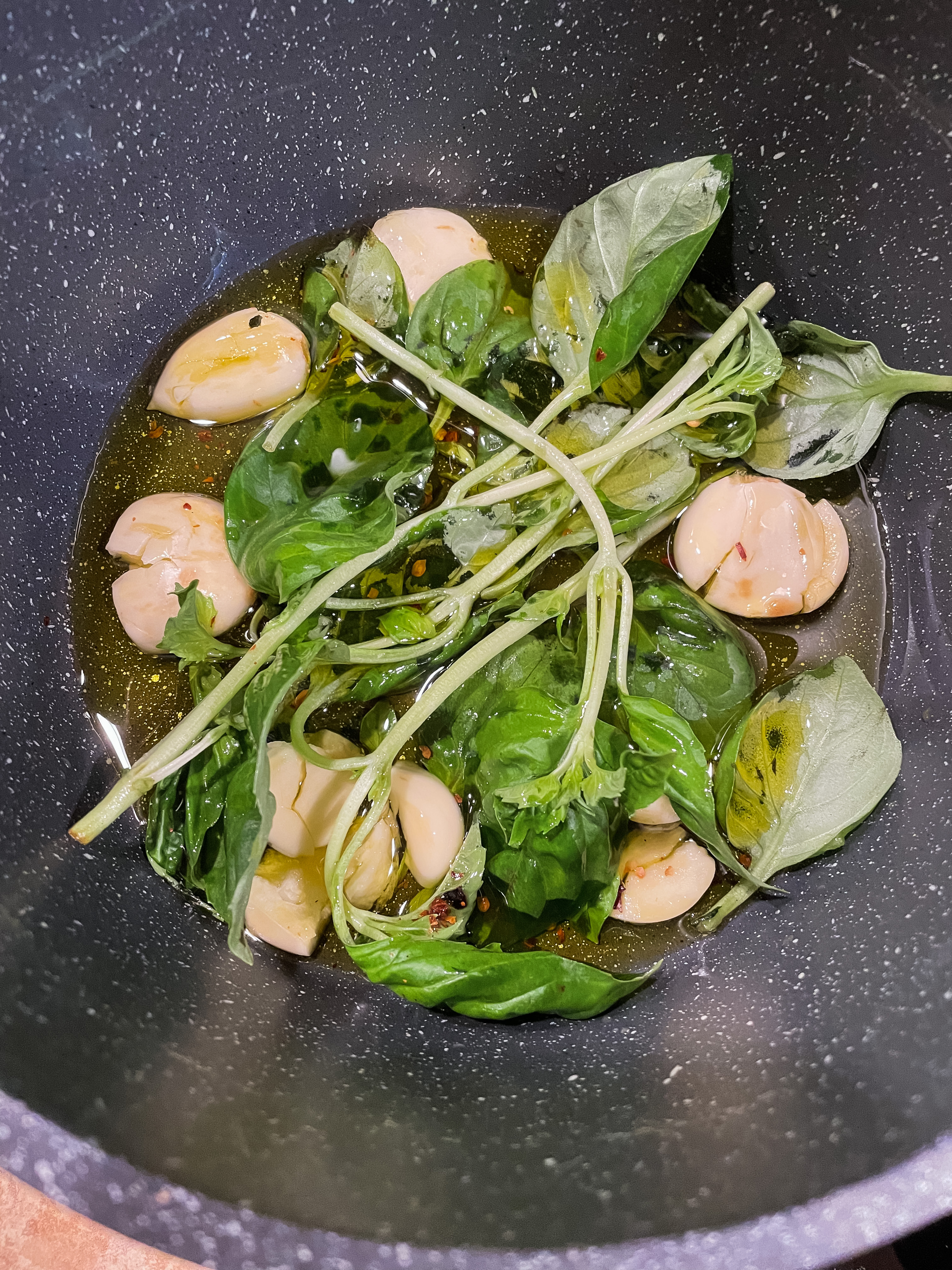 In a small saucepan, combine 1/2 Cup oil + garlic + 1/2 TSP red pepper flakes + basil. Turn heat to MED-LOW and let come to a boil. Simmer for 1-2 minutes/until basil is wilted. Remove from heat and let steep.