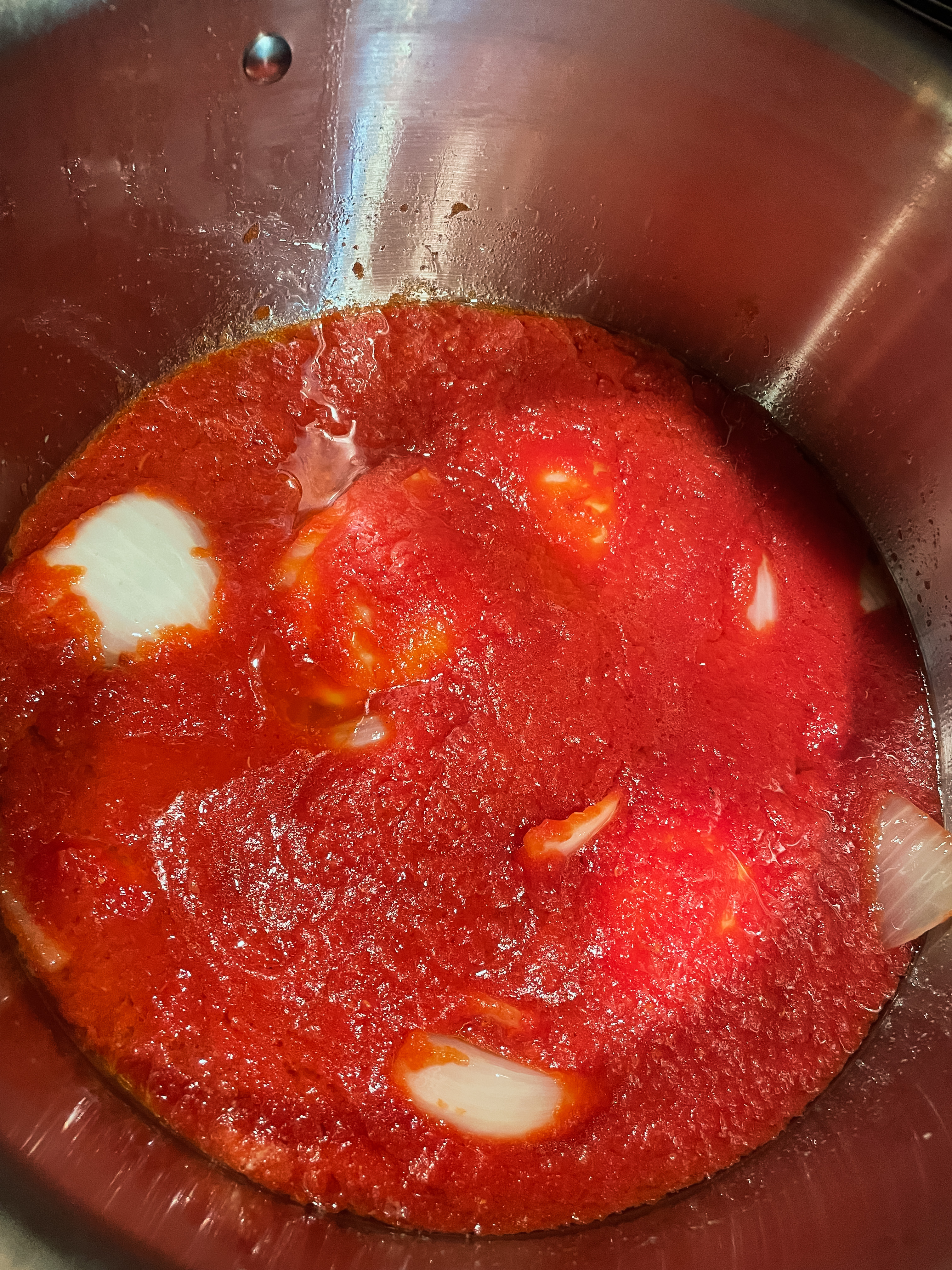 - 1 28oz Can of San Marzano tomatoes, which can be whole peeled or already blended [I used blended so I didn’t have to mash my tomatoes]
