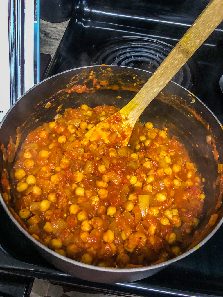 Add in the tomatoes with their juices, and 1/2 cup water. Using a wooden spoon, break up the tomatoes. Add in the chickpeas and use the spoon to mash up a quarter of them. Stir in the chopped apricots and increase heat to high. Once the mixture has come to a boil, reduce the heat to a simmer and stir occasionally. Let thicken for about 18-22 minutes. Once the time is up, taste and adjust for salt and remove from heat.