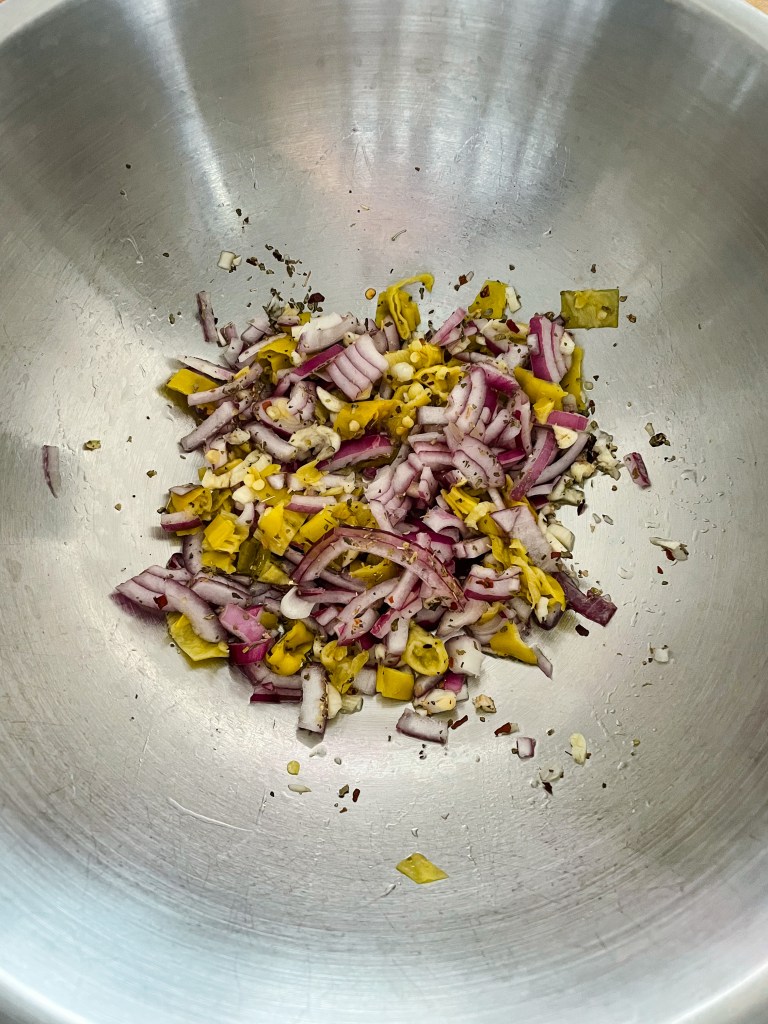 In a large bowl combine red onion + pepperonchini + garlic + oregano + basil + red pepper flakes. Mix well and let sit