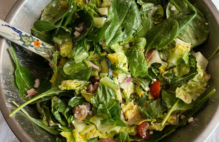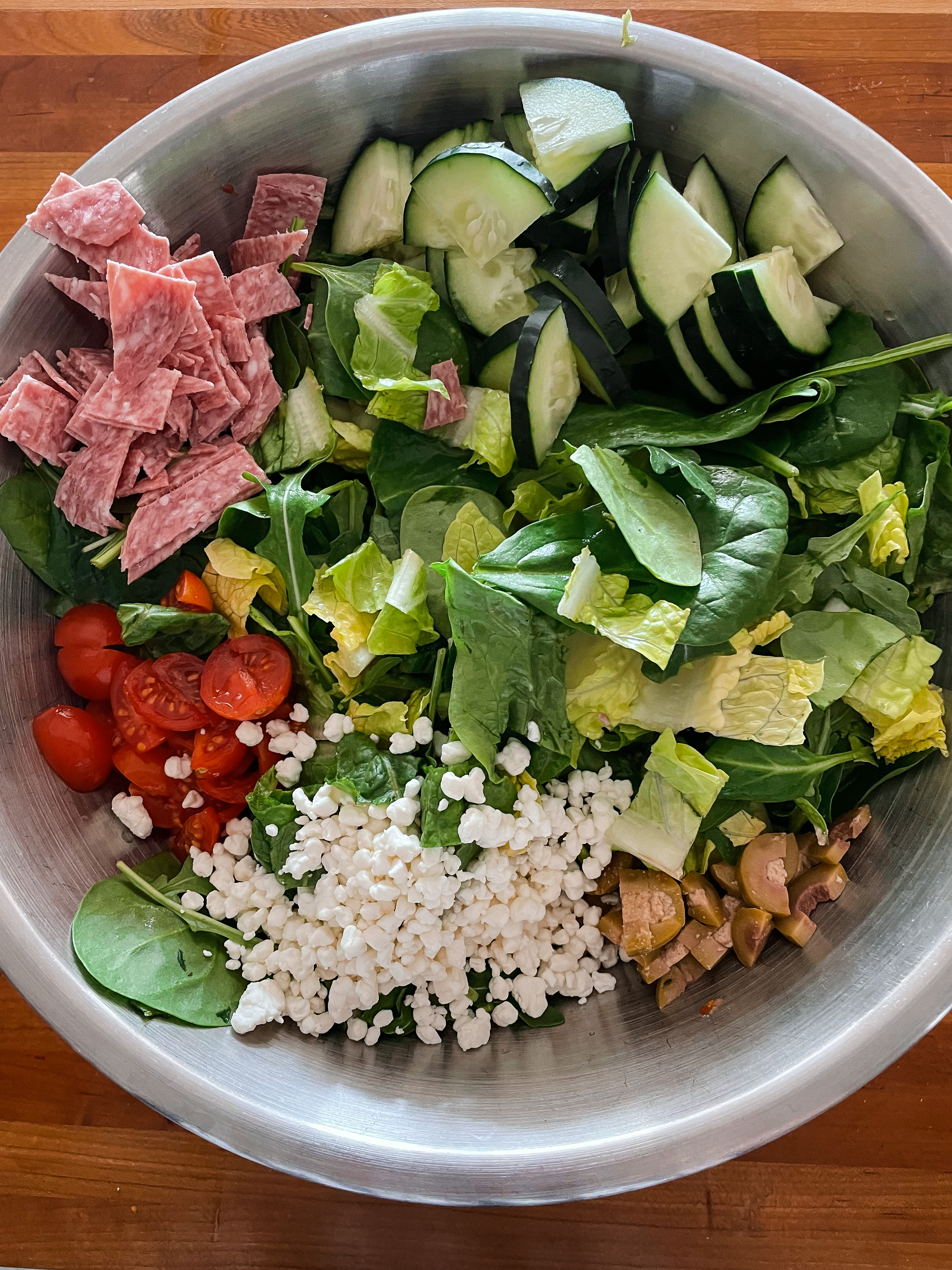 ‘Hannah, what are you eating for lunch this week?” What a fantastic question, thanks for asking! In the process of doom scrolling the other week I saw all these videos on Tik Tok about this grinder salad. It is basically a deconstructed hoagie/grinder whatever you want to call it. It is very similar to the Kitchen Sink Salad that I have posted about previously. The Tik Tok recipe calls for mayo which I opted to leave out as it would not keep well since I am making the salad for weekday lunches. The fun part about this salad & the kitchen sink salad is it’s another opportunity to make it your own and clear out your fridge at the same time!
